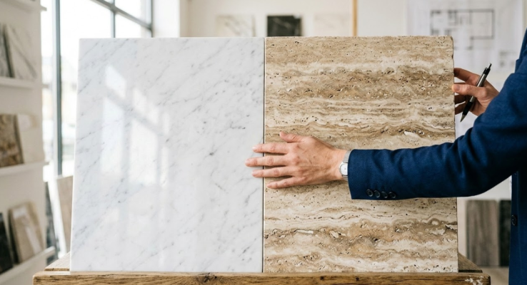 Marmură vs. Travertin: Cum alegi piatra potrivită pentru blatul de bucătărie sau pardoseală?